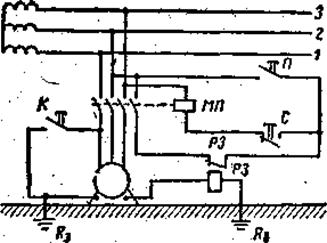 При нажатии кнопки П («Пуск») катушка магнитного пускателя МП. через кнопку С («Стоп») получает питание и замыкает свои контакты. Электроустановка включается и катушка МП становится на самоподхват нормально замкнутый контакт реле защиты РЗ. В реле устанавливают между корпусом электроуста-и вспомогательным заземлителем RB. При пробое на корпус катушка реле защиты РЗ срабатывает, икается его нормально замкнутый контакт и маг-пускатель отключает от сети электроустановку. кнопка контроля К. служит для периодической проверки нормальной работы отключающего устройства, следует иметь в виду, что катушка реле защиты РЗ может быть поставлена в цепь защитного заземления, работы защитного отключения применяют собственный заземлитель, который электрически не связан с" защитным заземлением. В случае если эти заземлители электрически связаны между собой, то при пробое изоляции „электроустановки оба конца катушки реле напряжения РЗ окажутся под одним потенциалом и система защитного отключения не сработает. Наиболее совершенными являются устройства, отключающие питание сети или отдельных потребителей в случае прикосновения человека к токоведущим частям, находящимся под напряжением. Такие защитно-отклющие устройства применяют в сетях напряжением 9/380 В. Время их срабатывания 30—50 мс. Токи, протекающие через человека за столь короткое время, не достигают допустимых значений, что позволяет значительно повысить электробезопасность при обслуживании электроустановок.