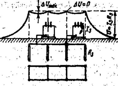 Распределение потенциалов на поверхности земли вне контура заземления отличается от распределения их при растекании тока с одиночного, заземлителя. Точки поверхности земли, имеющие нулевой потенциал, удалены от контура заземления значительно дальше 20 м — расстояния до нулевых потенциалов, при растекании тока с одиночного заземлителя.