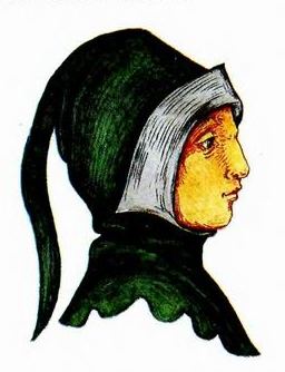 В XV в. самым распространенным головным убором всех сословий был капюшон с оплечьем, которое украшалось зубцами и бубенчиками. Его носили отдельно или пришивали к плащу. Длинный конец капюшона можно было завязать узлом.