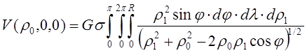 Задана сферическая система координат ρ, φ, λ с началом в центре шара (рис. 3.3), R – радиус шара, его плотность - σ. Потенциал притяжения тогда выразится так: