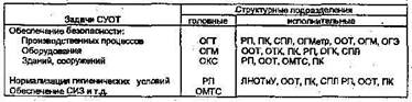 Для нормального функционирования СУОТП на каждом предприятия приказом распределяют функции но реализация задач управления охраной труда между голов-ными и исполнительными функциональными службами и структурными подразделениями предприятия. Пример-вое распределение таких функций приведено в табл. 5.