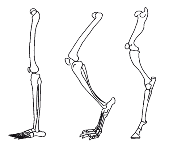 Задняя конечность человека, собаки и лошади (в разном масштабе). Видны различные способы опоры о землю: полной стопой (человек), на цыпочках (собака и кошка) и на вытянутом пальце (лошадь).