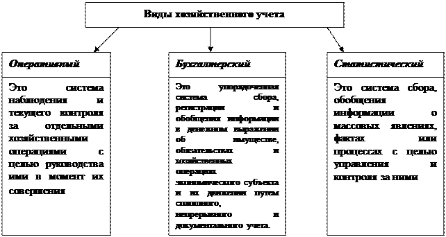 Хозяйственный учет представляет собой систему наблюдения, измерения и регистрации процессов материального производства с целью контроля и управления ими в условиях конкретного экономического строя. В зависимости от характера учетных сведений и способов их получения хозяйственный учет делят на оперативный, бухгалтерский и статистический: (см. рис. 1). Все виды учета взаимосвязаны, представляя собой систему хозяйственного учета, и отличаются методами и приемами, применяемыми в них.
