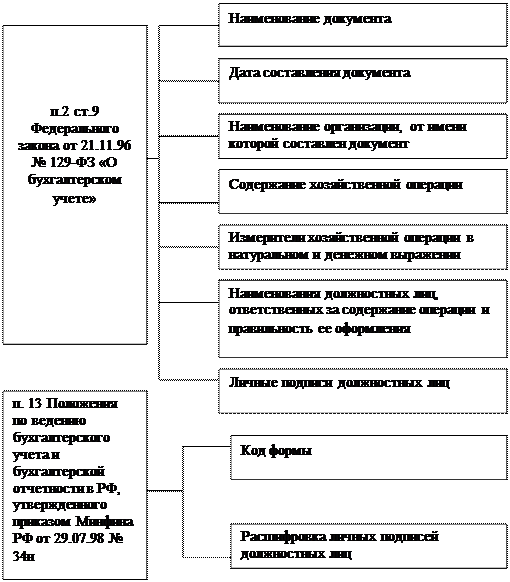 Документ – это письменное свидетельство о совершении хозяйственной операции. В этой связи все хозяйственные операции должны быть обязательно подтверждены первичными документами, чтобы быть отраженными в учете. Первичные документы устанавливают ответственность за совершение операции и позволяют осуществлять предварительный, текущий и последующий контроль. У любого документа должны быть реквизиты (см. рис. 7).