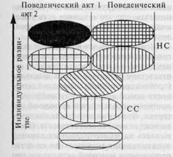сформированных при обучении актам, составляющим это поведение, но и одновременной реализацией множества более старых систем (рис.2.5, СС), сформированных на предыдущих этапах индивидуального развития. Последние могут вовлекаться в обеспечение многих поведений, т.е. относиться к элементам индивидуального опыта, общим для разных актов (рис.2.5).