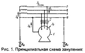 При занулении, если оно надежно выполнено всякое замыкание на корпус превращается в однофазное короткое замыкание (т.е. замыкание между фазами и нулевым проводом). При этом возникает ток такой силы, достаточной для расплавления плавкой вставки ближайшего предохранителя или отключения ближайшего автомата и автоматическое отключение поврежденной установки от сети. Зануление превращает замыкание на корпус в однофазное короткое замыкание, в результате чего срабатывает максимально-токовая защита и отключает электроустановку. В качестве максимально-токовой защиты применяют предохранители, автоматы. Область применения зануления — трехфазные четырехпроводные сети с глухозаземленной нейтралью источника тока (рис. 1).