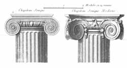 Ионический ордер оформился ненамного позже в конце VII - начале VI вв. до н.э. Ионическая колонна тоньше и выше. Здесь уже есть база сложная, состоящая из нескольких частей различных геометрических форм. Ствол прорезают 24 каннелюры, разделенные срезами. Увеличение количества желобков зрительно делает колонну еще более стройной и высокой. Эхин орнаментирован и с двух сторон оформлен волютами. Причем, если у центральных колонн волюты располагались диаметрально, то у угловых - на смежных "сторонах" колонны.