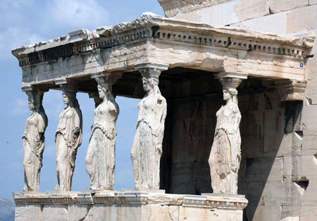 Ордер кариатид – не что иное, как сочетание ионийского или дорийского антаблемента со стволом в виде человеческой фигуры. Как пример, южный портик Эрехтейона, пользующийся наибольшей и заслуженной известностью Он является одним из тех произведений, на которых греческий гений проявился с наибольшей оригинальностью и свободой в формах, полных в то же время разумной сдержанности.