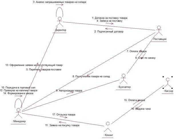 Главная особенность диаграммы кооперации заключается в возможности графически представить не только последовательность взаимодействия, но и все структурные отношения между объектами, участвующими в этом взаимодействии (рис. 3).