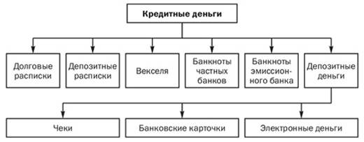 Кредитные деньги связаны с развитием товарного производства, когда купля-продажа осуществляется с рассрочкой или отсрочкой платежа (в кредит). Кредитные деньги возникают из производства и кругооборота капитала, когда денежный капитал принимает форму кредитных денег. Различают несколько разновидностей кредитных денег, системная характеристика которых представлена на рис. 1.4.
