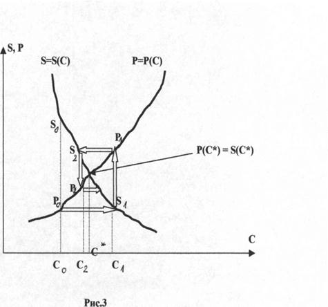 , после чего предложение падает и процесс повторяется. Получается простая модель экономического цикла. Постепенно рынок приходит в равновесие: спрос, цена и предложение устанавливаются на уровне S *, Р*,С* (см.рис. 3).