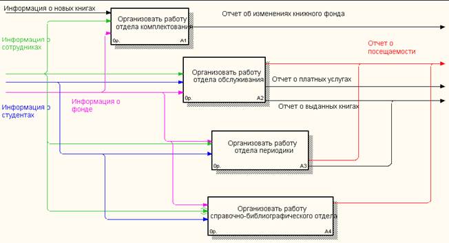 В дальнейшем диаграмма разбивается на уровни. Первый уровень – это диаграмма (рис. 2), с помощью которой производится детализация основного процесса, находящегося на контекстной диаграмме. Контекстную диаграмму разбиваем на 4 блока в соответствии с имеющимися в библиотеке отделами.