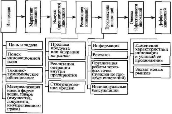Инновационный процесс состоит из семи элементов, соединение которых в последовательную цепочку образует соответствующую структуру. К этим элементам процесса относятся: инициация; маркетинг; выпуск (производство); реализация; продвижение; оценка экономической эффективности; диффузия.