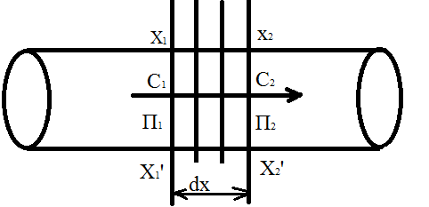 Выделим мысленно в трубе слой раствора бесконечно малой величины, и ограниченный плоскостями: Х1Х1' и X2X2' объем этого слоя V будет равен Sdx.