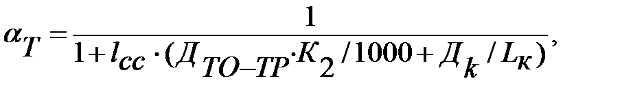 При расчете α т обычно учитываются простои подвижного состава, связанные с выводом автомобиля из эксплуатации, т. е. простои в КР, ТО-2 и ТР. Поэтому простои в ЕО и ТО-1, выполняемые в межсменное время, не учитываются. Удельный простой ДТО-ТР для автомобилей, работающих с прицепами, принимается, как для одиночных автомобилей, так как прицеп отделяется от автомобиля и ремонтируется отдельно.