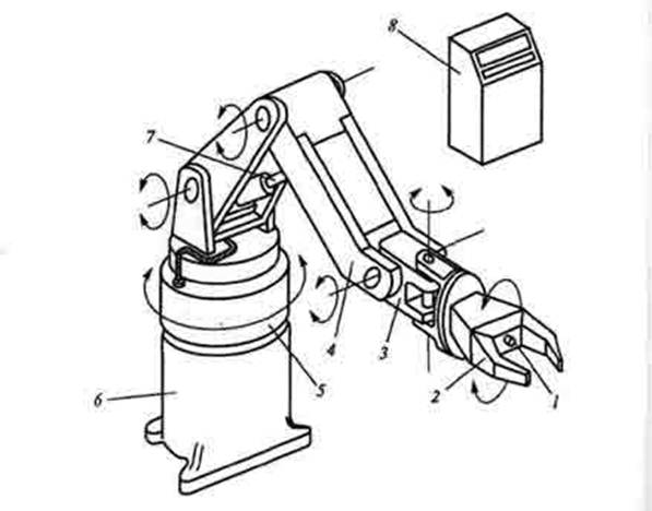 1 - датчик обратной связи; 2 — захватное устройство; 3 — кисть; 4 —рука манипулятора; 5 — колонна; 6 — несущая конструкция (основание); 7 - привод руки; 8 - блок управляющего устройства с пультом.