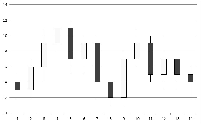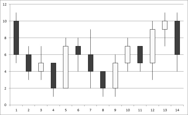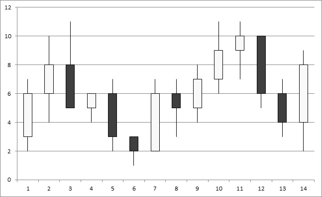 Обычно такой график строится за определенный период, например месяц, а каждая «свеча» обозначает результаты отдельного торгового дня. Входными данными для построения каждой «свечи» является последовательность чисел, в которой каждое число обозначает цену, по которой была осуществлена сделка. Первое число в последовательности является ценой открытия торгов в этот день, а последнее – ценой закрытия торгов.