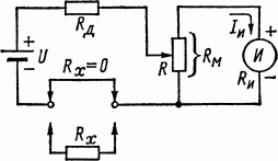 В верхней части рис. 5 приведён график основной относительной погрешности омметра δo, выраженной в процентах от значения производимого отсчёта. Из графика видно, что при измерителе класса точности 1,0 наименьшая погрешность (примерно 4%) имеет место при отсчёте в средней части шкалы, а к краям шкалы погрешность быстро возрастает. Поэтому диапазон измерений обычно ограничивают пределами (0,1...10)Rом. В общем случае отсчёт по графику следует умножать на класс точности применённого в омметре измерителя. Например, при работе омметра с измерителем класса 2,5 основная погрешность для середины шкалы составляет примерно 10%. В связи с резко неравномерным характером шкалы допустимое значение основной погрешности омметров часто выражают в процентах от длины шкалы. Например, при длине шкалы 100 мм и классе точности 1,5 основная погрешность омметра не превышает ± 1,5 мм; это означает, что действительному значению измеряемого сопротивления Rx может соответствовать отсчёт по шкале омметра в пределах ± 1,5 мм от полученной точки отсчёта. Источниками питания большинства омметров служат малогабаритные сухие или аккумуляторные элементы. Они имеют начальную э. д. с. примерно 1,5 В, которая в процессе эксплуатации постепенно уменьшается. При расчёте омметра обычно предусматривают возможность измерений при уменьшении э. д. с. каждого элемента примерно до 1 В. Внутреннее сопротивление одного элемента не превышает 1-2 Ом и при расчёте последовательных схем омметров им можно пренебречь. Если напряжение питания U отличается от расчётного напряжения U0, которому соответствует шкала омметра, то при Rx = 0 стрелка измерителя не будет устанавливаться на нуль шкалы и появится дополнительная погрешность измерений. С целью её уменьшения простейшая схема (рис. 16-2, б) дополняется регулятором, позволяющим устанавливать перед началом измерений стрелку измерителя на нуль шкалы омметра при Rx = 0. В некоторых омметрах установка нуля осуществляется при помощи магнитного шунта посредством регулировки тока полного отклонения измерителя Iи; при этом остаются неизменными входное сопротивление омметра и, следовательно, его градуировочная характеристика. В комбинированных измерительных приборах, в которых один и тот же измеритель используется как в схеме омметра, так и в схемах измерения напряжения, тока и т. д., применение измерителя с регулируемым при измерении сопротивлений магнитным шунтом недопустимо, поскольку это приведёт к возрастанию погрешности измерения других электрических величин. Поэтому в большинстве приборов применяют схемы омметров, в которых компенсация изменения напряжения питания осуществляется с помощью переменных резисторов или потенциометров. На рис. 6, а приведена схема омметра с последовательным включением реостата установки нуля R. Выбор сопротивления добавочного резистора по формуле: Rд=Uн/Iи-Rи (6) обеспечивает при Rx = 0, полностью выведенном реостате (R = 0) и наименьшем допустимом напряжении питания Uн отклонение стрелки измерителя И на всю шкалу. Если же омметр работает при напряжении, превышающем Uн, ток в цепи понижают до значения Iи вводом реостата R. Полное сопротивление реостата Rм выбирается из условия обеспечения установки нуля при максимально возможном напряжении питания Uм: Rм >= (Uм - Uн)/Iи (7). Входное сопротивление рассматриваемой схемы измен