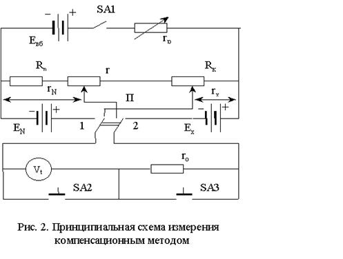 В процессе установки рабочего тока и при измерении возможны допустимые перегрузки гальванометра и нормального элемента током. Для защиты гальванометра и нормального элемента от перегрузок предусмотрено ограничительное сопротивление rо, включаемое последовательно с гальванометром. При приближении момента полной компенсации (указатель гальванометра стремится к нулю) это сопротивление шунтируется кнопкой SA1 (Рис.2), и восстанавливается полная чувствительность установки. Для быстрого успокоения гальванометра предусмотрена вторая кнопка SA2 шунтирующая сам прибор. Основным преимуществом потенциометров является то, что неизвестная ЭДС (напряжение) измеряется при помощи образцовой меры-нормального элемента, и прецизионных сопротивлений, изготовляемых с высокой степенью точности. Кроме того, измерение производится без потребления тока (мощности) от объекта измерения, поскольку ток гальванометра в момент измерения равен нулю. Оба этих обстоятельства определяют высокую точность компенсационного метода измерения и позволяют снизить погрешности современных потенциометров до сотых и даже тысячных долей процента.