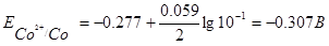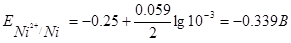 где Е° — стандартный электродный потенциал; n — число электронов, принимающих участие в процессе; с — концентрация (при точных вычислениях — активность) гидратированных ионов металла в растворе, моль/л; Е0 — для никеля и кобальта соответственно равны -0,25 и -0,277 В. Определим электродные потенциалы этих металлов при заданных концентрациях: