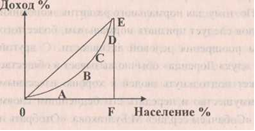Теоретическая возможность абсолютного равенства представлена биссектрисой ОЕ, которая указывает, что любой процент населения получает соответствующий процент дохода (20% населения получали бы 20% дохода, 40% - 40% дохода и т.д.)- Ломаная линия OFE иллюстрирует абсолютное неравенство и означает, что и 20%, и 40% и т.д. населения не получают никакого дохода, кроме одного — единственного человека, который присваивает 100% всего дохода. Кривая Лоренца (Макс Лоренц, американский экономист и статистик) OABCDE демонстрирует фактическое распределение дохода. Чем больше отклоняется эта линия от биссектрисы ОЕ, тем больше неравенство в распределении доходов. Эти линии несколько напоминают лук, где прямая линия — это корпус, а лежащая ниже кривая Лоренца — это слегка натянутая тетива. Чем сильнее натянута тетива «лука Лоренца», тем больше в стране неравенство семей по распределению дохода.