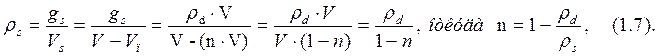Пористость грунтов определяется расчетом, так как лабораторные методы непригодны в связи с тем, что при заполнении пор водой породы набухают, и тем самым их пористость возрастает, и уже не будет соответствовать естественной пористости грунтов. Пористость определяется через показатель плотности минеральной части породы по формулам: