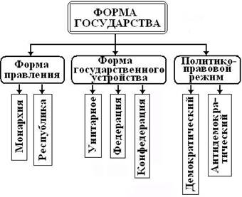 Таким образом, форма государства синтезируется из трех основных элементов, а именно: формы (государственного) правления, формы (государственного) устройства, формы (государственного, политического) режима:
