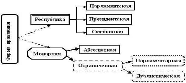 1) форма правления – особый порядок образования и организации высших органов государственной власти и управления, распределение компетенции между ними (монархия и республика);