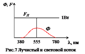 Световой поток Ф – мощность потока излучения, оцениваемая по световому ощущению, которое она вызывает у селективного приемника - стандартного фотометрического наблюдателя, криваяотносительной спектральной чувствительности глаза которогостандартизована МКО. Иначе говоря, световой поток‑ это эффективно преобразованный глазом поток излучения.