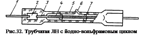 Колба ГЛН (рис.32) выполняется из кварцевого стекла, способного выдержать высокие температуры. В процессе эксплуатации это стекло не допускает прикосновения пальцами, так как восприимчиво к жиру. В связи с тем, что вольфрам не обязательно возвращается в самые дефектные части ГЛН, она выходит из строя из-за обрыва тела накала, часто вызванного обрывом держателей.