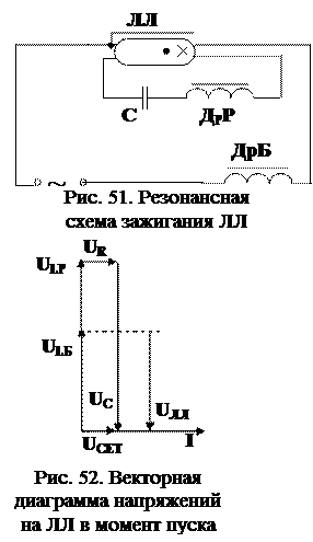 В схеме (рис. 51) наряду с ЛЛ и балластным дросселем ДрБ используются конденсатор С и резонансный дроссель ДрР.