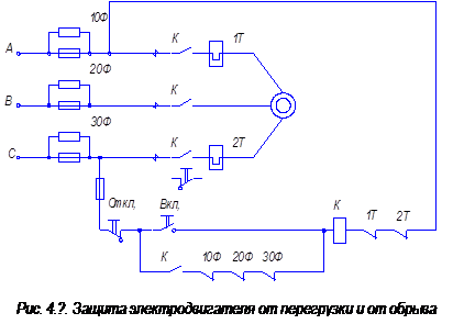 Защита от перегрузки. Данная защита выполняется токовой или температурной, то есть реагирующей соответственно на возрастание тока или температуры обмоток или других частей двигателя. Токовая защита имеет выдержку времени и может выполняться посредством автоматов с заземленным срабатыванием или посредством реле косвенного действия – тепловых или электромагнитных.