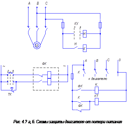 Защита от потери питания (минимальная защита напряжения). Данная защита может быть реализована контактором (автоматом), удерживающая катушка которого (для автомата обмотка расцепителя) подключена к силовой сети через ключ с самовозвратом или кнопочное управление. Когда напряжение сети снижается до (0,4÷0,5) Uном., ток протекающий через удерживающую катушку становится недостаточным, и контактор размыкает свои силовые контакты. В случаи управления ключом с фиксированным положением рис. 44 для минимальной защиты напряжения, применяется реле напряжения KV, которое размыкает цепь удерживающей катушки при напряжении 0,25÷0,7Uном. (в зависимости от уставки и типа реле). Чтобы минимальная защита напряжения не отключала двигатель при кратковременном снижении напряжения (например, при быстро ликвидируемых КЗ в питающей сети), вводится выдержки времени. Однако при оперативном отключении двигателя (дежурным персоналом) необходимо мгновенное отключение электродвигателя, перечисленным требованиям удовлетворяет схема рис. 4. В схеме рис. 4, применено двухпозиционное реле фиксации команды ФК, (типа РП-351), которое питается от независимого источника питания. Реле времени KT (типа ЭВ-235), начинает отсчет времени при снятии напряжения с его обмотки. При включении КУ, реле ФК запитывается и своими контактами замыкает цепь катушки контактора К, при этом блок контакт контактора подает питание на обмотку реле времени. При исчезновении напряжения в силовой сети, или его снижении до величины (0,4÷0,5)Uном., контактор К размыкает контакты, и реле KT начнет отсчет времени. Если восстановление напряжения произойдет раньше замыкания контакта KT, то через контакты не переключившегося реле