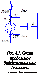 Для повышения чувствительности защиты, когда К2<2, при КЗ на выводах, выполняют более чувствительную дифференциальную защиту. Так как данную защиту нет необходимости отстраивать от пусковых токов. Установка такой защиты обязательна для электродвигателей мощностью 5000 кВт и более. Схема защиты для одной из фаз статора показана на рис. 42.