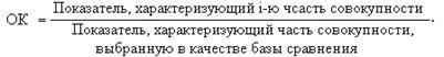 При этом в качестве базы сравнения выбирается та часть, которая имеет наибольший удельный вес или является приоритетной с экономической точки зрения. В результате получают, сколько единиц каждой структурной части приходится на 1 единицу (иногда на 100, 1000 и т. д. единиц) базисной структурной части.