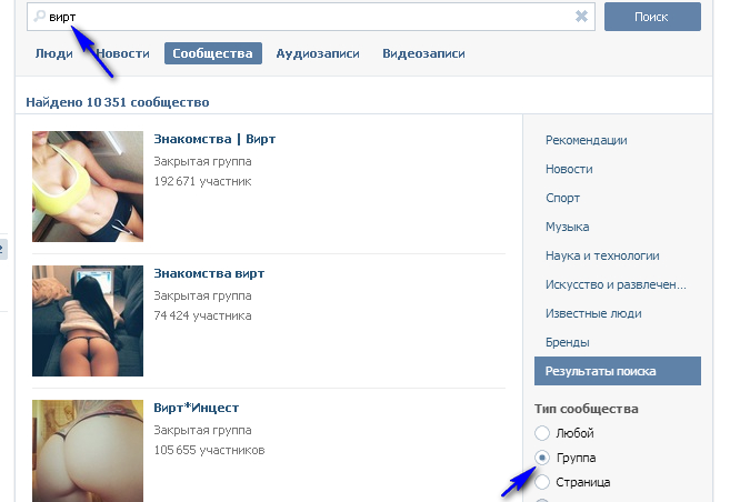 Теперь в соц сети ВКонтакте делаем следующее; Сверху жмём на кнопку «Сообщество» и в строке поиска вводим слово «флирт», «вирт»или «знакомства» на выбор. Внизу справа ставим галочку «Группы» и ищем открытые группы.