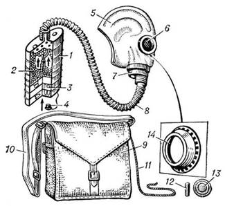 1 — противогазная коробка; 2 — специально обработанный активированный уголь; 3 — аэрозольный фильтр; 4 — резиновая пробка; 5 — шлем-маска; 6 — очки; 7 — клапанная коробка; 8 — соединительная трубка; 9 — противогазная сумка; 10 — лямка; 11 — тесьма; 12 — специальный карандаш; 13 — незапотевающие пленки; 14 — утеплительная манжета.