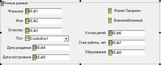 Займемся первой таблицей. В свойстве Caption компонента GroupBox впишите “Личные данные”, это название отразится в заголовке панели. Далее на эту панель следует установить восемь компонентов DBEdit с вкладки DataControls палитры компонентов, два DBCheckBox для редактирования логических данных, и один компонент DBComboBox для списка, а также поясняющие компоненты Label.