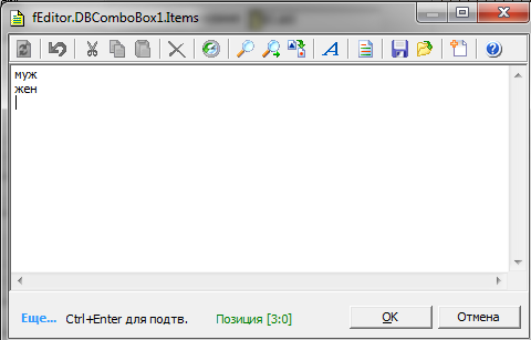 Немного доработаем компонент DBComboBox. Щелкните дважды по его свойству Items, открыв редактор. В нем введите две строки: