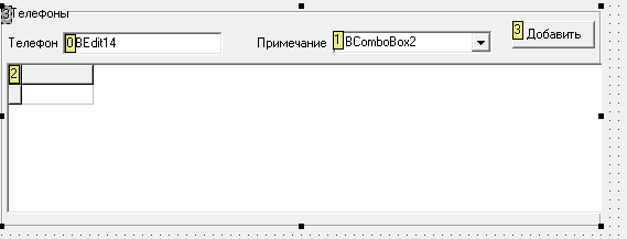 А для таблицы Telephones понадобится один DBEdit, один DBComboBox, сетка DBGrid и кнопка Button. Сетка нужна для контроля введенных телефонов, ведь здесь связь один-ко-многим, и телефонов может быть несколько. В редакторе Items компонента DBComboBox введите три строки: