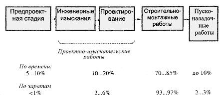 Инвесторы, стремящиеся получать прибыль от построенного объекта, заинтересованы в том, чтобы продолжительность инвестиционного цикла была как можно меньшей, ибо в течение всего инвестиционного цикла вложенные деньги становятся как бы "замороженными", т.е. не дающими прибыли. Ввод же объекта в эксплуатацию означает начало постепенного "возврата" вложенных денег. Учитывая, что срок окупаемости капитальных вложений в РФ составляет 7...8 лет, легко подсчитать, что ввод промышленного объекта на 1... 1,5 месяца раньше намеченного срока для инвестора равносилен удешевлению такого объекта примерно на 1% (за счет ускорения оборачиваемости капитальных вложений). Это означает принципиальную возможность парадоксальной на первый взгляд ситуации, когда удорожание проектно-изыскательских или строительно-монтажных работ может оказаться для инвестора экономически выгодным, если оно повлечет за собой существенное ускорение работ, т.е. приближение срока сдачи объекта в эксплуатацию. Напротив, затягивание сроков строительства ("долгострой") всегда влечет за собой большие экономические потери, так как оно удаляет сроки получения прибыли (или социального эффекта) от эксплуатации построенных объектов. По этой причине крупные стройки всегда должны разбиваться на очереди продолжительностью в промышленном строительстве не более З...3,5 лет, в природообустройстве - не более 4...5 лет. Введенные в строй производственные мощности первой очереди способны давать прибыль, которая будет в значительной мере компенсировать затраты на последующую очередь строительства. Аналогичным образом разделение систем природообустройства на очереди во многих случаях позволяет, не дожидаясь полного окончания крупного строительства, получать частичный эффект уже в первые полтора-два года. Это является исключительно важным фактором как с экономической, так и экологической точек зрения.