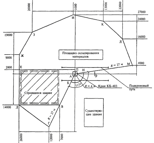 Зона внутри ломаной линии (точки А, Г, Д - М) обозначает зону работы крана. Зона вне этой ломаной является зоной запрета. Зона предупреждения, находящаяся внутри зоны работы, на этом плане не показана.