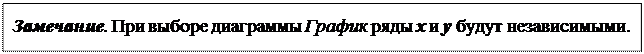 Рассмотрим использование одной из часто втречаюшихся диаграмм – Точечная. Точечная диаграмма (XY– точечная) отображает взаимосвязь между числовыми значениями в нескольких рядах в координатах XY. При подготовке данных в первом ряду помещаются значения аргумента (ось X), во втором (и последующих рядах) – значения функции (функций), соответствующие значениям аргумента из первого ряда данных и откладываемых по оси Y.