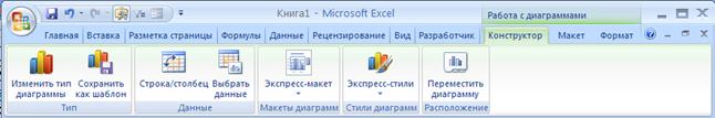Тип диаграммы; макеты диаграмм, стили диаграмм, расположение диаграмм можно изменить с помощью вкладки Конструктор.