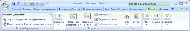 Если щелкнуть по диаграмме, то в ленте меню откроется Работа с диаграммами.