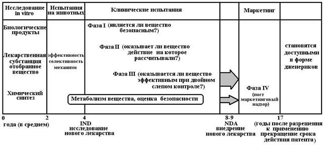 На схеме 2 показаны основные этапы движения лекарства в процессе его разработки и изучения. После завершения III фазы клинических испытаний документация вновь поступает в Фармакологический комитет (объем полного досье может составлять до 1 млн. страниц) и в течение 1-2 лет регистрируется в Государственном реестре лекарственных средств и изделий медицинского назначения. Только после этого фармакологический концерн имеет право начать промышленный выпуск лекарственного средства и его распространение через аптечную сеть.