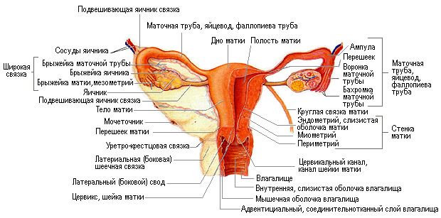 Маточные трубы начинаются от боковых краев матки в области ее дна, проходят в верхней части широкой связки матки в сторону боковых стенок таза и заканчиваются около яичников. Один конец маточных труб открывается в матку (маточное отверстие), другой — в брюшную полость (брюшное отверстие). Начальный отдел маточных труб, находящийся в толще стенки матки, называют маточной (интерстициальной) частью, средний отдел — перешейком, отдел, следующий за перешейком кнаружи и постепенно увеличивающийся в диаметре, — ампулой, к-рая заканчивается воронкой с многочисленными выростами (бахромками трубы). Длина маточных труб — 10-12 см, ширина просвета маточной части — 0,5-1 мм, перешейка — ок. 3 мм, ампулы — 6-10 мм.