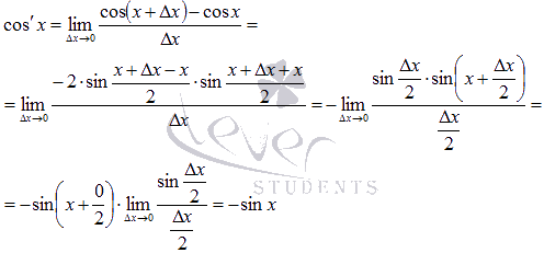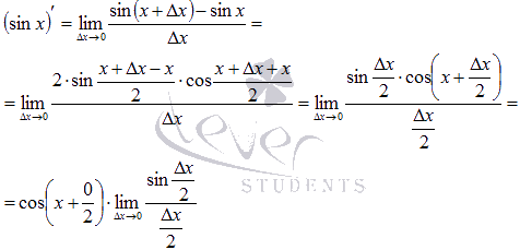 Для вывода формул производных тригонометрических функций нам придется вспомнить некоторые формулы тригонометрии, а также первый замечательный предел.