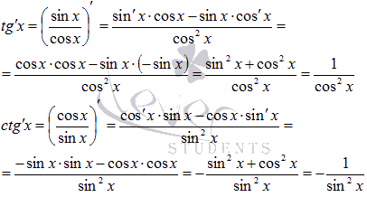 Вывод формул таблицы производных для тангенса и котангенса проведем с использованием доказанных правил дифференцирования (производная дроби).