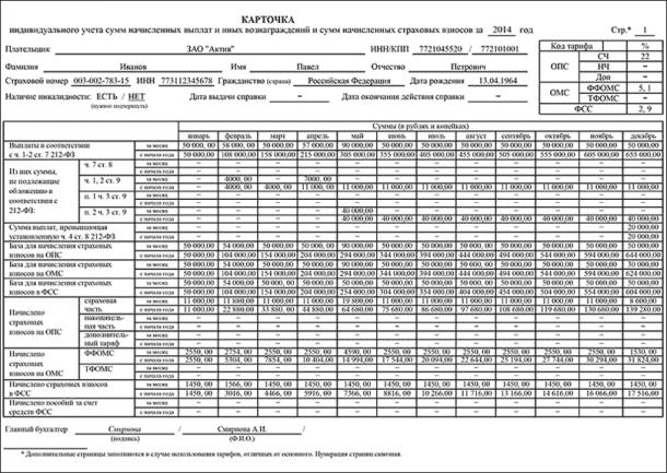 В карточке индивидуального учета фиксируются все выплаты, отражаются не облагаемые взносами суммы, а также рассчитывается база страховых взносов и суммы самих взносов во все фонды: в ПФР, в ФФОМС и в ФСС.